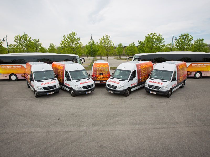 Am 10. Juli feiert „Anatevka“ Premiere auf der Seebühne in Mörbisch. Und an diesem Tag werden auch die im Seefestspiele-Look gestalteten Blaguss-Reisebusse zum ersten Mal Besucher zur Veranstaltung shutteln. „Die Blaguss-Busse sind die perfekte Werbefläche, sie stechen sofort ins Auge“, sagt Intendantin Dagmar Schellenberger, denn bis zum Shuttle-Einsatz sind die zwei großen Reisebusse und die fünf Mercedes Sprinter im Wiener Stadtgebiet und Großraum Wien im Einsatz.