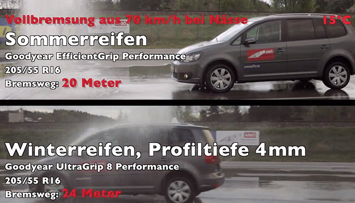 Beim Reifentest im ARBÖ Fahrsicherheitszentrum Straßwalchen-Salzburg bei 5 Grad und nasser Fahrbahn betrug der Bremsweg des VW Touran bei einer Vollbremsung aus 70 km/h mit abgenützten Winterreifen Goodyear UltraGrip 8 Performance (205/55 R16) mit 4 mm Restprofil zwei Meter weniger als mit Sommerreifen Goodyear EfficientGrip Performance.