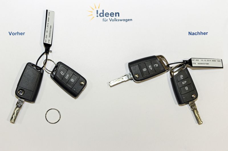 So werden die Fahrzeugschlüssel nicht wie bisher üblich mit einem Metallring ausgeliefert, sondern nur mit dem Kunststoffband auf dem zum jeweiligen Auto Informationen wie Fahrzeugidentnummer aufgedruckt ist.Allein bei den Modellen Golf, Golf Sportsvan und Tiguan spart VW dadurch rund 130.000 Euro pro Jahr ein.