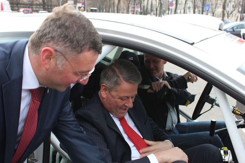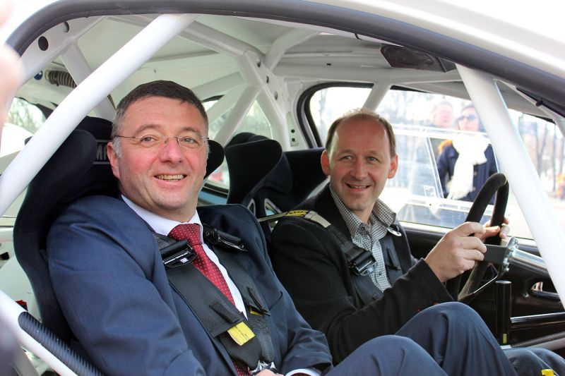 Bei der Pressekonferenz war auch Rallye-Ass Manfred Stohl mit dabei, der im ersten Elektro-Rallye-Auto nicht nur beide Minister auf eine Spritztour rund ums Burgtheater mitnahm, sondern auch seine Leidenschaft zum Thema unterstrich.