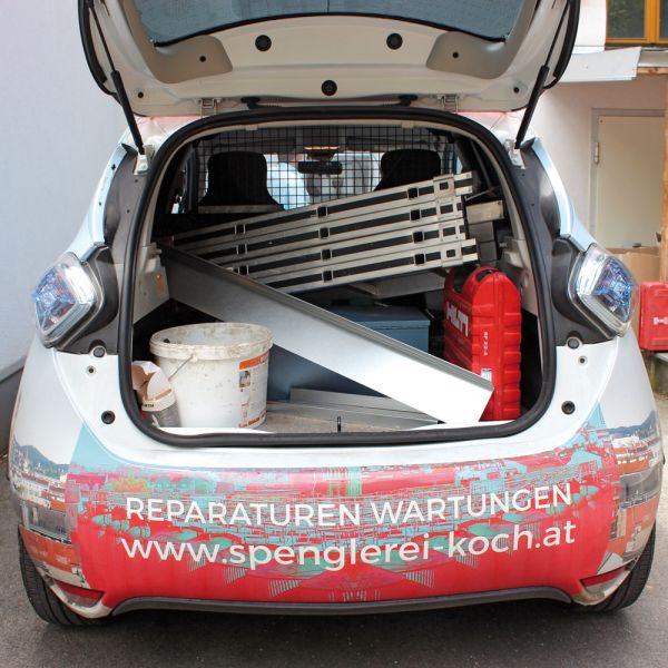 Die Flotte wuchs beständig, heute umfasst sie sechs Renault Kangoo Z.E., zwei Zoe, einen Twizy und einen BMW i3, die größte E-Flotte Österreichs eben, „in Relation“, wie Koch erläutert, „denn von zwölf Autos im Fuhrpark sind zehn Elektroautos. Diesen Prozentsatz schafft nicht mal die Post, obwohl die sehr ambitioniert ist.“ Selbstverständlich arbeitet der umtriebige Spenglerei-Chef daran, seinen eigenen Prozentsatz zu erhöhen. Als nächstes Mobil im Visier hat er daher einen Lkw, den Fuso Canter E-Cell, der in den nächsten eineinhalb Jahren kommen soll und den derzeitigen Koch’schen Diesel-Bruder, der dann 15 Jahre alt sein wird, ablösen wird. Abgesehen von der deutlich leiseren und emissionsfreien Art der Fortbewegung mit den Elektrofahrzeugen freut sich Koch über hohe Einsparungen. Für den früheren Fuhrpark, der ebenfalls zwölf Autos umfasste, allerdings alle mit Verbrennungsmotoren, betrugen die kompletten Kosten 100 bis 110.000 Euro pro Jahr. Jetzt macht dieser Faktor 60 bis 70.000 Euro pro Jahr aus, kommendes Jahr werden sie sich laut Koch bei 50.000 Euro einpendeln, da dann auch die Leasingraten wegfallen.