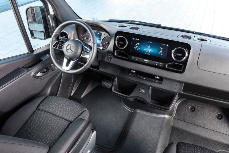 Dazu ist der Sprinter nun auch "online": Mit Marktstart stehen insgesamt acht "Mercedes Pro connect"-Pakete mit zentralen flotten-, fahrzeugfahrer- und standortbasierten Datendiensten zur Verfügung, die über ein Abo-Modell abgerechnet werden. Darunter befinden sich etwa Routenplanungsprogramme, Software zum Wartungs-und Reparaturmanagement sowie ein digitales Fahrtenbuch. Gesteuert wird das alles über eine Smartphone- App, per Sprachbefehl oder über ein bis zu 10,25 Zoll großes HD-Touchdisplay des völlig neuen MBUX-Multimediasystems, das erst kürzlich in der neuen Mercedes-Benz A-Klasse eingeführt wurde. Unter anderem soll durch die Dienste etwa die Flottenfahrzeug-Steuerung vereinfacht werden, da Flottenmanager und Fahrer direkt miteinander kommunizieren können.