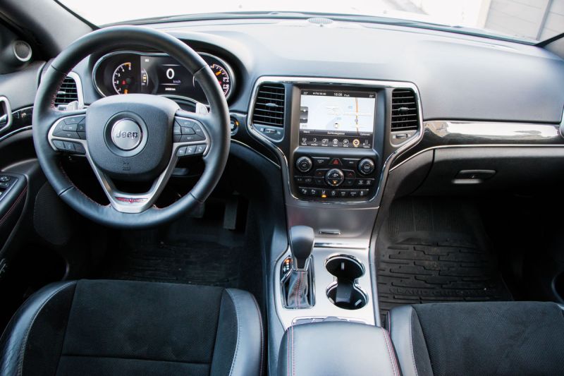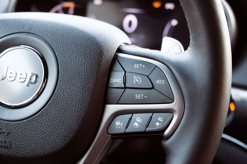 Die Trailhawk-Serienausstattung kann sich sehen lassen, von der Lederpolsterungüber Luftfederung, Navi, elektrische Memory-Sitze bis hin zu Bi-Xenon-Scheinwerfern und zahlreichen anderen Annehmlichkeiten reicht das inkludierte Angebot. Kein Wunder, dass die Liste der Extras kurz ausfällt, in unserem Testwagen war noch das Technologie- Paket für 1.300 Euro verbaut. Das beinhaltet beispielsweise einen adaptiven Tempomaten (zusätzlich zum normalen, siehe Foto links), Spurhalte-, Totwinkel- und Parkassistent.