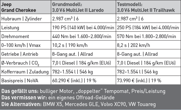 Power satt Motorisch schöpft der Jeep aus dem Vollen, der Dreiliter-Sechszylinder bringt es in der stärkeren Ausbaustufe auf 250 PS und ein sattes Drehmoment von 570 Newtonmetern. Nach nur 8,2 Sekunden zeigt der Tacho Tempo 100, kein schlechter Wert für 2,5 Tonnen Leergewicht. Und fein, wenn man bis zu 3,5 Tonnen an denHaken nehmen kann. Erfreulicherweise geht auch der Verbrauch mit knapp über neun Litern in Ordnung. Was auch für den Preis gilt, 73.990 Euro sind in Anbetracht der Ausstattung im Konkurrenzumfeld schon fast günstig.