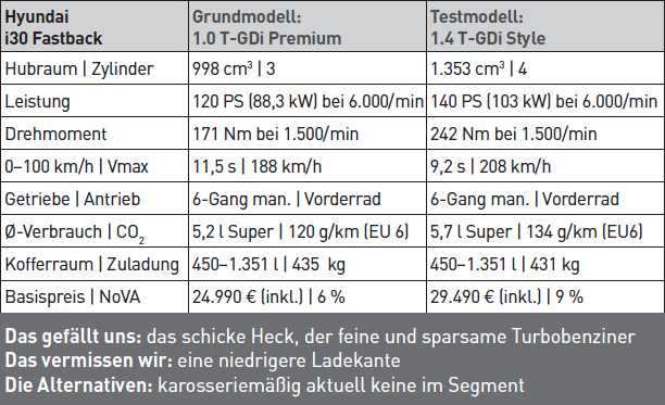 Doch auch sein Inneres samtübersichtlicher Armaturen und üppiger Ausstattung überzeugt, wenn auch Mitfahrende auf der Rückbank - konstruktionsbedingt aufgrund der Platzverhältnisse -kleine Abstriche machen müssen. Nach Drücken des Startknopfes schadet ein Blick auf den Drehzahlmesser nicht, denn der 140 PS starke Benzinmotor geht äußerst leise zur Sache. Er entfaltet seine Leistung über ein 6-Gang-Schaltgetriebe und verleiht dem i30 Fastback tadellose Fahrleistungen: Der Sprint aus dem Stand auf 100 km/h ist in 9,2 Sekunden erledigt, die Höchstgeschwindigkeit beträgt 208 km/h. Auch in puncto Trinkverhalten gibt es wenig zu meckern: Zwischen sechs und sieben Liter Super pro 100 Kilometer genehmigte sich der Koreaner. Uns hat der i30 Fastback sowohl auf der Langstrecke als auch in der Stadt überzeugt, wobei sich der i30 Fastback-Lenker auch dank der umfangreichen Sicherheitsausstattung auf wachsame Helferlein verlassen kann: Vom autonomen Notbremsassistent inklusive Frontkollisionswarner mit Fußgängererkennung über einen aktiven Spurhalteassistent bis hin zu Abstandsregeltempomat, Toter-Winkel-, Fernlichtund weitere Assistenten reicht das Angebot.