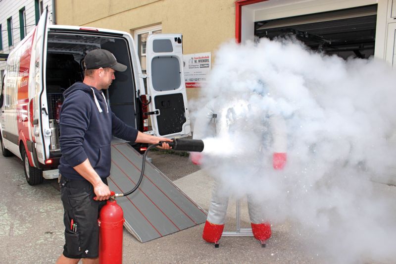 Entflammt und zügig hat er auch sein derzeitiges Prunkstück im Fuhrpark, einen Hyundai H350, erstanden. Beim Händler seines Vertrauens gesehen, für passend gefunden und gekauft. Des H350 bedeutsame Aufgabe: Er ist Löschübungsfahrzeug. Die Feuerlöschtechnik W. Wienerl verkauft nicht nur Feuerlöscher, Rauchabzüge und Brandschutzvorrichtungen, wartet Rauch-und Abzugsanlagen oder Nasssteigleitungen, sondern führt auch Brandschutzschulungen und Löschübungen bis hin zu Evakuierungstrainings durch. Dafür ist ein umfassendes Equipment notwendig. Brennbare Müllcontainerattrappe, Löschtrainingsgerät oder Brandpuppe, um nur einige zu nennen. "Dafür haben wir ein großes, kompaktes und ordentliches Transportfahrzeug gebraucht. Der H350 ist da ideal."