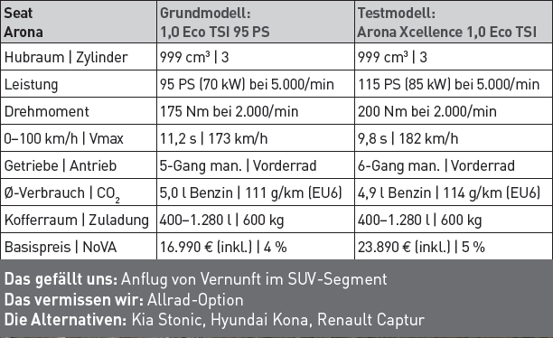 Kleinwagen sind bekanntlich sparsam, praktisch und pfiffig. Motorisch erfüllt der Arona Punkt 1 in drei Benziner-und zwei Dieselvarianten mit Normverbräuchen zwischen vier und fünf Litern, Allradantrieb ist klassenüblich keiner vorgesehen. In puncto Pfiffigkeit ist für den Herbst im Zuge der Seat-CNG-Offensive ein monovalenter Erdgas-Arona angekündigt. Im Ibiza hatuns die Variante, den energischen Dreitopf mit Gas zu betreiben, überzeugt. Man darf gespannt sein, wie die als ökologisch unbedenklich(er) geltende Verbrenner-Variante in den Schauräumen auf Gegenliebe stößt.