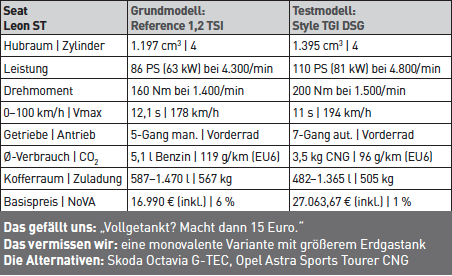 So hat man auch im von uns gefahrenen Leon ST TGI dank 50-Liter-Benzintank die Wahl, ob der althergebrachte Flüssigtreibstoff die Reichweite weit über die 1.000-Kilometer-Marke hinaus erweitert oder ob man die volle Kostenersparnis mitnimmt und ca. 300 Kilometer um die 15 Euro fährt, die eine Gasfüllung kostet. (Um 20 Prozent günstiger als der Landesrest fahren Tiroler, bei denen kostet das Kilogramm Erdgas nur 0,80 Euro.) Unser Testverbrauch pendelte sich folgerichtig auf weniger als 5 kg/100 km ein.
