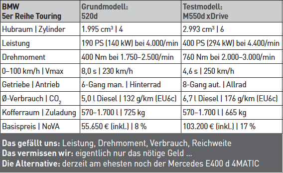 Da die Bayern leider auch bei diesem 5er aktuell keine Anstalten machen, einen M5 Touring, ja nicht einmal einen M550i Touring aufzulegen, ist der M550d der stärkste BMW-Kombi. Dass der auch seinen Preis hat, ist klar. Mindestens 103.200 Euro sind fällig, nach oben ist die Skala traditionellerweise fast offen. Und so kommt unser Testauto auf knapp 149.000 Euro. Spätestens dann ist klar: Der niedrige Verbrauch wird nicht das Hauptargument beim Kauf sein.