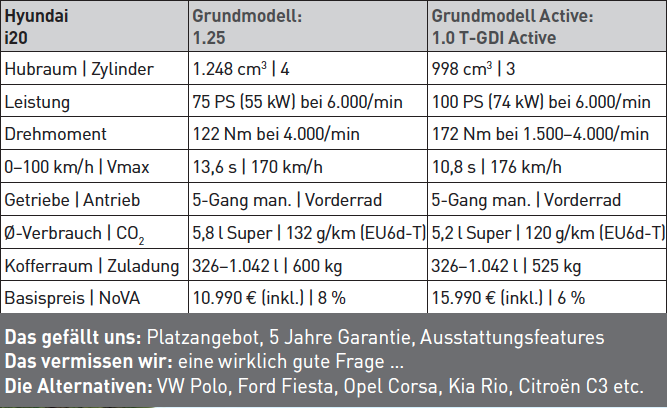 Optisch kann man den neuen Jahrgang sowohl im Front-als auch im Heckbereich vom Vorgänger unterscheiden, viele Zutaten kennt man von anderen Hyundai-Modellen wie etwa dem Kona. Das sehr gute Platzangebot blieb unangetastet, der i20 zählt ohne Frage zu den geräumigsten Fahrzeugen seines Segments. Der Kofferraum ist mit 326 Litern ebenfalls überdurchschnittlich, klappt man die Rücksitzlehnen um, finden bis zu 1.042 Liter Platz. Bereits das Basismodell ist mit einer Klimaanlage ausgestattet, die nächsthöhere Variante bietet darüber hinaus Bluetooth-Freisprecheinrichtung, getönte Scheiben, ein Lederlenkrad und weitere Annehmlichkeiten. Das Topmodell bringt unter anderem Einparkhilfe vorn und hinten, Regensensor, Fernlichtassistent und eine Rückfahrkamera.