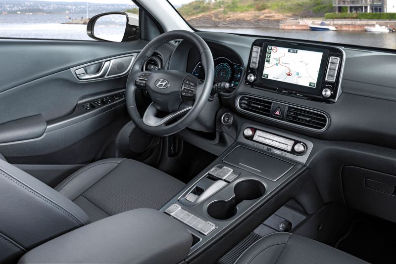 Ab Herbst wird man sehen, wie die Österreicher auf das verlockende Angebot anspringen. Immerhin versprechen die 204 PS Motorleistung jede Menge Fahrspaß, wenn einmal nicht versucht wird, die maximale Reichweite aus der 64-kWh-Batterie herauszuquetschen. 7,6 Sekunden auf 100 km/h – der Kona Elektro muss sich nicht als Ökosandalen-Mobil verunglimpfen lassen. Im Alltag ist die Frage nach den Kilometern, die mit voll geladenen Lithium- Polymer-Akkumulatoren zu absolvieren sind, natürlich berechtigt. 482 Kilometer nach WLTP, antwortet Hyundai. Komplett alltagstauglich, sagen wir. Im Vergleich zum Verbrenner-Kona fällt die geschlossene Front, in der sich auf Fahrerseite die Klappe für den Stromanschluss versteckt, auf. Neue Stoßfänger und eigene Aero-Felgen sollen für weniger Luftwiderstand sorgen. Der Innenraum präsentiert sich auf der Höhe der Zeit, was von digitalen Instrumenten zur Versorgung mit wichtigen Infos (Energiefluss, Fahrmodus, etc.) bis zu den Tasten für das „Shift-by-Wire“-Getriebe reicht. Ein lichtstarkes Head-up-Display zeigt nicht zuletzt Hinweise der zahlreichen Assistenzsysteme an. Immerhin sind unter dem Namen „Hyundai Smart Sense“ ein adaptiver Abstandsregeltempomat, ein Notbremsassistent mit Fußgängererkennung, Spurhalteassistent und einiges mehr zusammengefasst. Dass bei einem der modernsten Pferde im Hyundai-Stall nicht extra nach der Smartphone- Anbindung gefragt werden muss, sollte spätestens jetzt klar sein. Der Blick in die Optionenliste ist ein kurzer: Nur das Leder- Paket und das elektrische Schiebedach müssen extra bezahlt werden, zudem gibts ein attraktives Full-Service-Leasing ohne Restwertrisiko für Unternehmen.