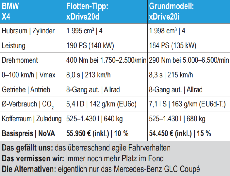 Die SUV-Coupés polarisieren wie kein anderes Fahrzeug segment. Entweder man findet die flachen Hochbeiner interessant oder man kann ihnen nicht einen Deut Sympathie abgewinnen. Dazwischen gibt es kaum emotionale Schattierungen. Wie auch immer, Fakt ist, die SAV (Sport Activity Vehicle), wie BMW seine X-Baureihe mit den geraden Zahlen nennt, finden im Flottenbereich bei User-Choosern zusehends Beachtung. Ein Grund, den neuen X4 etwas näher unter die Lupe zu nehmen.