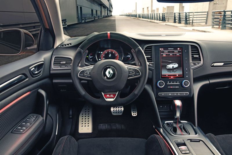Bevor wir den fetten roten Startknopf drücken, wechseln wir in den Mégane R.S., der in den Grundzügen dem normalen Mégane entspricht. Seriensitze und -lenkrad sind rausgeflogen und wurden durch entsprechend sportliche Zutaten ersetzt, auch die digitalen Anzeigen -auf diese Technik setzt auch die Alpine -unterscheiden den Sport-vom Serientrimm. Außen macht der von Renault Sport entwickelte Fünftürer auch kein Hehl aus seiner Power, erst recht nicht, wenn man zum satten Sirius-Gelb greift, das ebenso perfekt passt wie das Blau zur Alpine. Im direkten Vergleich wirkt der Mégane R.S. muskulöser als die geradezu zierliche Alpine, vor allem der Heckabschluss mit fettem Diffusor und nicht minder dick auftragender, mittig platzierter Auspuffblende weist auf das Leistungsplus hin. Dafür hat Renault auf einen eher peinlichen großen Heckspoiler verzichtet.