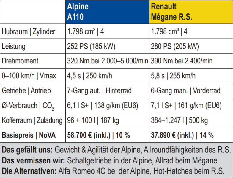 Statt Mittelmotor und Heckantrieb gibt"s hier klassischen Frontmotor und Vorderrad. Solange es nicht nass ist, bringt der Mégane seine 280 PS auch ordentlich auf die Straße. Mit seiner Schwester mitzuhalten, ist dennoch ein Ding der Unmöglichkeit, die knapp 400 Kilogramm zusätzlich und die im Vergleich nicht so perfekte Gewichtsverteilung zollen Tribut. Der R.S. eine Spaßbremse? Mitnichten! Auch wenn er an die Agilität der Alpine nicht ganz herankommt, eine Spaßmaschine ist der Power-Mégane dennoch. Dazu trägt auch die Vierradlenkung bei, mit der sich der Franzose noch flotter um die Ecken werfen lässt. Begeistert hat uns auch die Lenkpräzision, bei einem Fronttriebler nicht selbstverständlich. Und ineinem Punkt ist er der Alpine klar überlegen, gibt"s doch fünf Sitzplätze und einen Kofferraum mit 384 bis 1.247 Litern statt zwei Ministauräumen unter der Front-und Heckhaube. Und wie schaut"s last but not least mit dem Preis aus? Nun, die Alpine startet bei 58.700 Euro in der Version "Pure", aktuell liegt die Wartezeit allerdings bei rund zwölf Monaten. Der Renault Mégane R.S. wechselt zu einem Top-Preis ab 37.890 Euro den Besitzer. Für zusammen 96.590 Euro gibt"s damit ein Fahrspaß-Paket, mit dem man für alle Eventualitäten gerüstet ist.