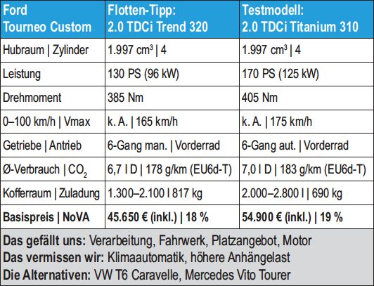 Die Preisliste des Ford Tourneo Custom, also der Pkw-Variante, startet bei 40.400 Euro (brutto), dafür bekommt man den Bus mit kurzem Radstand, 105 PS Turbodiesel und 6-Gang-Schaltgetriebe in Ambiente-Basisausstattung. Um dem gehobenen Anspruch des überarbeiteten Tourneo Custom gerecht zu werden und zu überprüfen, wie er sich im Vergleich zu den Luxusbussen im Segment schlägt, haben wir uns an der anderen Seite der Preisliste orientiert. Dann hat der Zweiliter-Turbodiesel satte 170 PS unter der Haube und wird von einer 6-Gang-Automatik verwaltet, der lange Radstand und die Titanium-Ausstattung mussten es dann auch sein. 54.900 Euro brutto sind jedenfalls eine starke Ansage, der Aufpreiszum erwähnten Einstiegsmodell fällt moderater aus, als zunächst angenommen. Erst recht, wo Annehmlichkeiten wie eine beheizbare Frontscheibe, Regensensor, 17-Zoll-Leichtmetallfelgen, eine eigene Klimaanlage für den Fond, das Radio-Paket samt Freisprecheinrichtungen und weitere Dinge aufpreisfrei mit an Bord sind. Ergänzt um eine 220-Volt-Steckdose, Fahrspur-und Totwinkel-Assistenten, Metallic-Lackierung und das Titanium-X-Paket 1 (Xenon-Scheinwerfer, Lederausstattung, elektrisch verstellbarer Fahrersitz, Sitzheizung, sechs Airbags sowie das neue Sync-Navigationssystem) für insgesamt wohlfeile 3.300 Euro, liegt der Gesamtpreis unseres Testautos bei ziemlich genau 60.000 Euro.