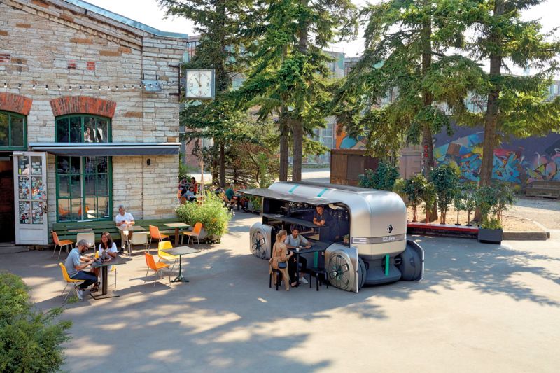 Um eine möglichst große Bandbreite an zu transportierenden Waren abdecken zu können, sind sowohl der Leader-Pod als auch die unbemannten Transport-Pods modular konzipiert. Sie bestehen dabei jeweils aus dem Unterbau mit Batterie, Fahrwerk und Elektroantrieb, auf dem sich austauschbare Container montierenlassen, wobei das Innenleben von kleinen bis größeren Schließfachsystemen bis hin zu voll eingerichteten Food Trucks reicht. Ein weiterer Vorteil: Der modulare Aufbau erlaubt es auch, reine Transportcontainer am Stadtrand vom Lkw auf die Plattformen umzuladen und sie dann emissionslos in die Stadt zu schaffen. Bis es so weit ist, wird es logischerweise noch dauern, doch van der Acker ist sich sicher, dass die ersten autonomen Transporte in zehn bis 15 Jahren Realität sein werden.