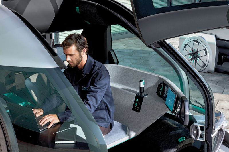 Der Faktor Mensch stand für den Designer des EZ-Pro Laurens van der Acker von Beginn an im Mittelpunkt: "Ein Mensch vermittelt im Transportprozess immer Sicherheit. Sei es zur Überwachung der autonom fahrenden Fahrzeug-Pods, bei der Zustellung besonders wertvoller Ware, der Erledigung von komplizierten Transportformalitäten oder der Paketübergabe an betagte oder gehandicapte Personen, in all diesen Fällen ist ein Mitarbeiter vielfach besser als eine Maschine." Die Aufwertung des Berufsbilds schlägt sich dabei auch in der Gestaltung des Arbeitsplatzes nieder: In jedem "Leader Pod" ist an der Fahrzeugfront eine Fahrerkabine eingerichtet, die einem ergonomisch und komfortabel gestalteten Büro gleichkommt. Darin wurden laut dem Designer ausschließlich Materialien - beispielsweise Wollfilz, schwarzer Kork und Leder - verwendet, die sonst im Möbeldesign verwendet werden. Im Normalfall befreit vom eigentlichenSteuern des Fahrzeugs beziehungsweise des Fahrzeugzugs kann sich der Mitarbeiter in dieser heimeligen Umgebung den Warenempfängern widmen und sie beispielsweise über das Eintreffen ihrer Lieferung informieren oder die Route umplanen. Ist ein menschliches Eingreifen beim Fahren gefordert, etwa beibesonderen Gegebenheiten oder unübersichtlicher Verkehrslage, kann er die Kontrolle über den EZ-Pro übernehmen und per Joystick steuern.