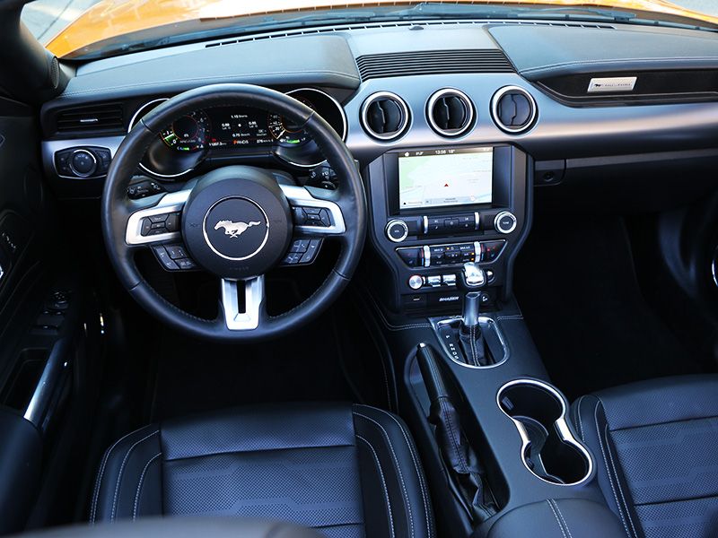 Alleine die Daten lassen den Mitteleuropäer gleichzeitig freudig Grinsen und fragend den Kopf schütteln: V8, Big Block, 5.0 Liter Hubraum, 450 PS. Das sieht, spürt und hört man hierzulande eher selten, deshalb sei die Frage erlaubt: „Muss denn das wirklich sein?" Nein, muss es nicht. Aber es macht unglaublich viel Spaß! Und der beginnt bereits beim Drücken des Startknopfs, wenn die acht Kolben den Takt vorgeben und die Maschine zu blubbern beginnt - und bei jedem noch so sanften Berührens des Gaspedals laut aufheult. Spätenstens beim 4,3-Sekunden-Sprint auf Tempo 100 weiß man, es ist nicht nur Schall und Schein unter der Haube des Amerikaners, die Leistung wird auch auf den Asphalt gebracht, zumindest bei eingeschalteter Traktionskontrolle. Und das sehr brutal und kompromisslos. Durch das neue Dämpfersystem „MagneRide" liegt das Wildpferd nun besser auf der Straße, durch seine zehn (!) Gänge schaltet die ebenfalls überarbeitete Automatik unaufgeregt aber flott. Der Durst ist groß, 15,3 Liter dürfen es bei artgerechter Fahrweise sein - es geht aber auch deutlich drunter. Ein astreiner Sportwagen will der Mustang weiterhin nur bedingt sein, immerhin bringt er fast 1,8 Tonnen auf die Waage und ist alles andere als „kompakt". Er ist und bleibt ein Gran Turismo. Und lädt gerade als Cabrio zum Cruisen ein. Apropos Cabrio, das Verdeck öffnet sich zügig und ruhig - typisch amerikanisch müssen aber zwei Abedeckungen händisch angeklippst werden. Im Kofferraum gibt es mit 332 Litern sogar noch Platz für zwei Koffer - es muss also nicht beim kurzen Wochenendausflug bleiben.