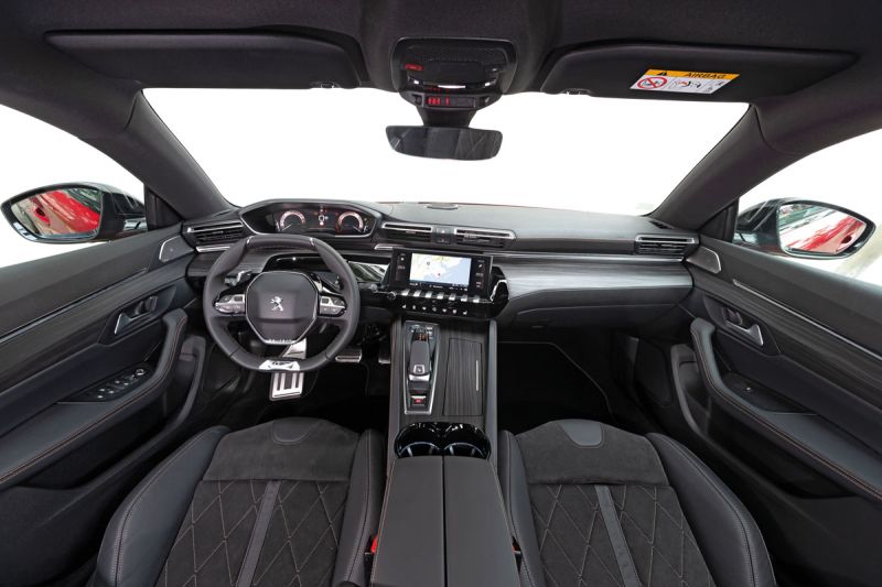 Überhaupt, vieles deucht ein bisschen unfranzösisch im Inneren der Limousine, die mit ihrem flachen langen Heck unverkennbar mit dem Trend zum fünftürigen Coupé kokettiert und auf diesem Weg als Nebenwirkung eine Gepäckhöhle schafft, die den Wagen zum Reisemobil für vier bis fünf Personen qualifiziert. Wer mehr Gepäck – oder ein noch schärferes Hinterteil – spazierenfahren will, greift zum Kombi, pardon, SW, der ebenfalls schon das Licht der Veröffentlichung erblickt hat und demnächst seinen zweifelsohne fulminanten Auftritt in den Autohäusern des Landes hinlegen wird. Da wäre einmal das volldigitale i-Cockpit über dem etwas kleinen und unkonventionell geformten Lenkrad, das im Test nicht nur mit erfrischenden Ideen verblüffte, wie man diverse Fahrparameter dem Auge gefällig präsentiert, sondern auch mit einer Nachtsichtfunktion, die präzise auf Fußgänger oder Fahrradfahrer aufmerksam macht. Das Hauptmenü der Infotainment-Einheit bedient man mithilfe einer Art Klaviatur unter dem Bildschirm, die sich nach kurzer Gewöhnungszeit als beinahe intuitiv bedienbar und äußerst praktisch herausstellt.