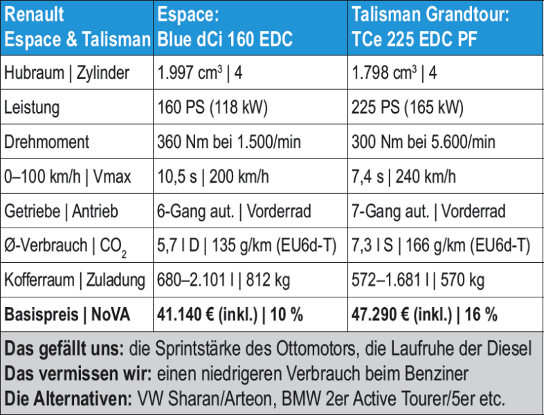 Doch auch die beiden Zweiliter-Dieselmotoren, die mit 160 bzw. 200 PS vorerst für den Espace (ab Jänner 2019 dann auch im Talisman) angeboten werden, sind nicht von schwacher Natur. Interessant: Der Motor wird in zwei Leistungsstufen (dCi 160 PS bzw. 360 Nm, 200 PS bzw. 400 Nm) angeboten und verfügt über 0,4 Liter mehr Hubraum als die Vorgänger-Varianten. Beide Leistungsstufen sind darüber hinaus serienmäßig mit einem Sechsgang-Doppelkupplungsgetriebe erhältlich. Dank neu entwickeltem SCR-Katalysator konnten die Stickoxid-Emissionen um 90 Prozent gesenkt werden, weshalb beide Motoren auch problemlos die Euro-6d-Temp-Norm erfüllen. Verbrauchsseitig geben sich die Triebwerke auf dem Papier sparsam und sollen laut Norm nur 5,1 (160 PS) beziehungsweise 5,3 Liter Diesel (200 PS) verbrauchen. Unter der für den 1,5-prozentigen Sachbezug wichtigen Marke von 121 Gramm liegt aber keiner. Der fünfsitzige Espace mit dem neuen 160-PS-Diesel ist ab 41.140 Euro, die 200-PS-Variante ab 45.840 Euro erhältlich. •