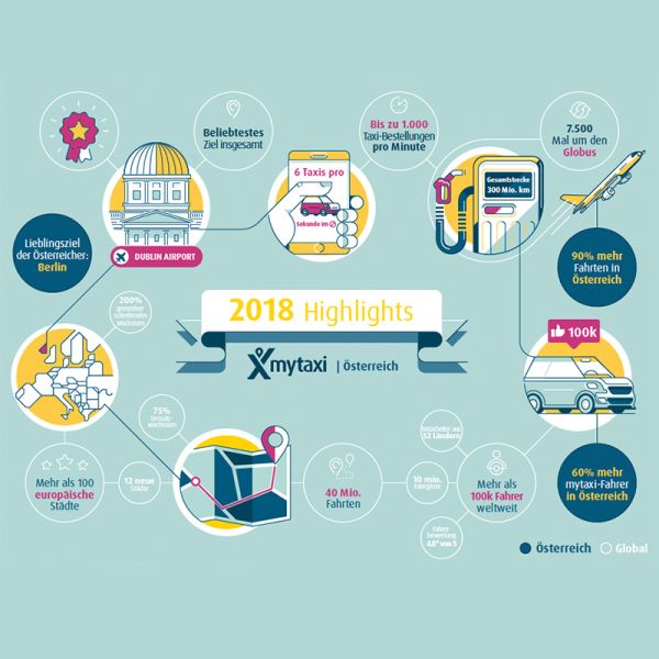 90 % mehr Fahrten, 60 % mehr Fahrer und 112 % mehr Flughafen-Touren. Das ist die Bilanz, die mytaxi für 2018 allein in Österreich zieht. Europaweit stieg der Umsatz um 75 %. Rekord für die Taxi-App. Während die Umsatzzahlen stiegen, konnte mytaxi in einem wesentlichen Bereich einsparen: der Wartezeit bei einer Taxi-Bestellung sank um 20 Sekunden auf durchschnittlich weniger als 3,5 Minuten.