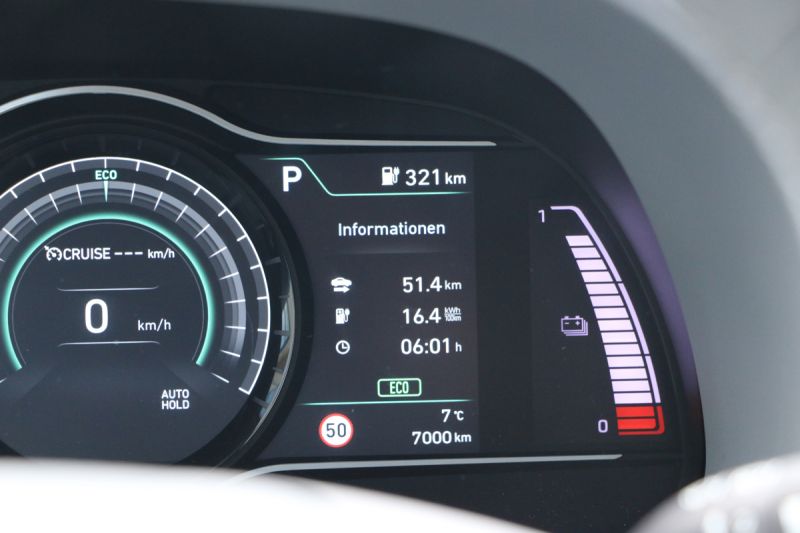 Und wir sollten nicht enttäuscht werden, ganz im Gegenteil. Bereits auf unserer Testrunde, 50 Kilometer in der Stadt, Überland und auf der Autobahn bei einer Außentemperatur von knapp über null Grad Celsius, machte der Kona Elektro mit einem Durchschnittsverbrauch von 16,4 kWh ordentlich Eindruck. Hochgerechnet auf die Akkukapazität von 64 kWh wären das an die 400 Kilometer Reichweite. Doch wie sieht die Sache bei überwiegendem Autobahnanteil und den erlaubten 130 km/h aus? Auch hier schlägt sich der Hyundai mit Bravour. 20,7 kWh waren es bei diesem Test, immer noch rund 300 Kilometer, bis der Akku leer ist. Wir sind diese Autobahntour auch im Oktober bei milden 17 Grad gefahren und damals auf einen Schnitt von 17,9 kWh gekommen, der Kältezuschlag beim Durchschnittsverbrauch hält sich mit rund drei kWh auf 100 Kilometer also in erfreulichen Grenzen.