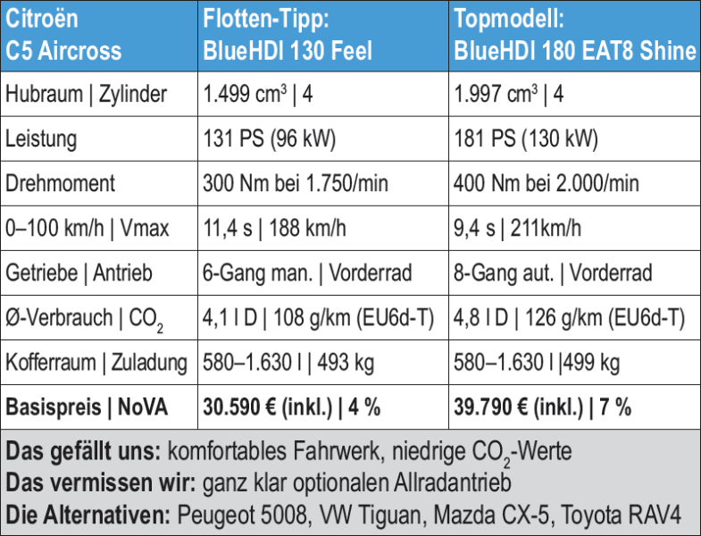 Erste Testkilometer mit den jeweils 180 PS starken Benzin- und Dieselmotoren bescheinigen gute Harmonie mit dem großen Citroën. Der Kofferraum fasst - je nach Stellung der verschiebbaren Rücksitze - 580 bis 720 Liter und bietet damit mehr Platz als der Grand C4 Spacetourer. Einzig die Beinfreiheit im Fond ist nicht ganz so üppig und die drei Einzelsitze sind zwar alle gleich breit, aber dennoch nicht übertrieben komfortabel. Die Preisliste startet bei 25.490 Euro für den 130-PS-Benziner, der 180-PS-Turbodiesel in Topausstattung kommt auf 39.790 Euro. Fein: Der 130-PS-Diesel kommt auf einen CO2-Ausstoß von nur 108 Gramm. •