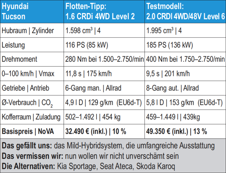 Doch nicht nur im Stillstand, auch bei beim Tritt auf das Gaspedal unterstützt der Mild-Hybrid-Starter-Generator (MHSG) mit bis zu zwölf Kilowatt Leistung den Vortrieb. Und, geht man vom Gas oder bremst, rekuperiert der Generator und speist die Lithium-Ionen-Batterie. Zusätzlich werden auch die elektrischen Verbraucher über das 48-Volt-System versorgt, das spart Leistung und damit Kraftstoff. Zwar sind die 5,8 Liter nach WLTP in der Praxis kaum erreichbar, aber für einen 185-PS-Turbodiesel samt Allradantrieb und 8-Gang-Automatik sind auch knapp über sieben Liter auf 100 Kilometer kein schlechter Wert. Bringt das Hybridsystem im Alltag viel, kostet es jedoch ein wenig an Laderaum. Dennoch bietet der Tucson mit 459 bis 1.449 Litern genug Kofferraumvolumen für den Familienurlaub.