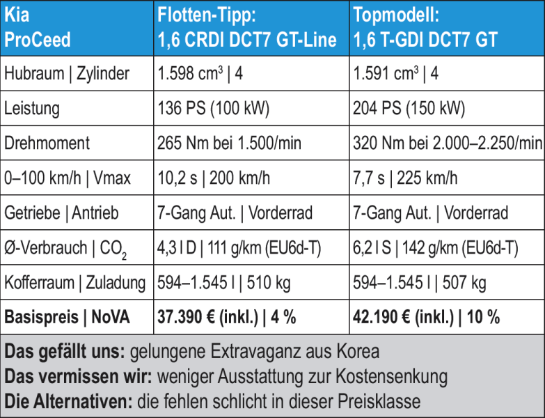Nach dem Stinger, der als Stachel im Fleisch der deutschen Sportlimousinen verstanden wird, findet nun mit dem ProCeed ein Shooting Brake zu den Händlern, der ein Thema aufnimmt, das bisher vor allem Mercedes bespielte. Mit 33.090 Euro Basispreis hat Kia natürlich ein besonderes Ass im Ärmel, denn der ProCeed bietet bereits die Ausstattung GT Line mit adaptivem Tempomaten, zahlreichen Assistenten, rundum Parksensoren und vielen Extras, dieschon bei nahezu jedem Fünftürer-Ceed in Serie an Bord sind (Lenkradheizung, Zweizonen-Klimaautomatik und mehr). Sieben Jahre Garantie (bzw. 150.000 Kilometer) und sieben Jahre Navigations-Updates bei Werks-Navis sind für Flottenkunden weiterhin ein gutes Argument für einen Kia.