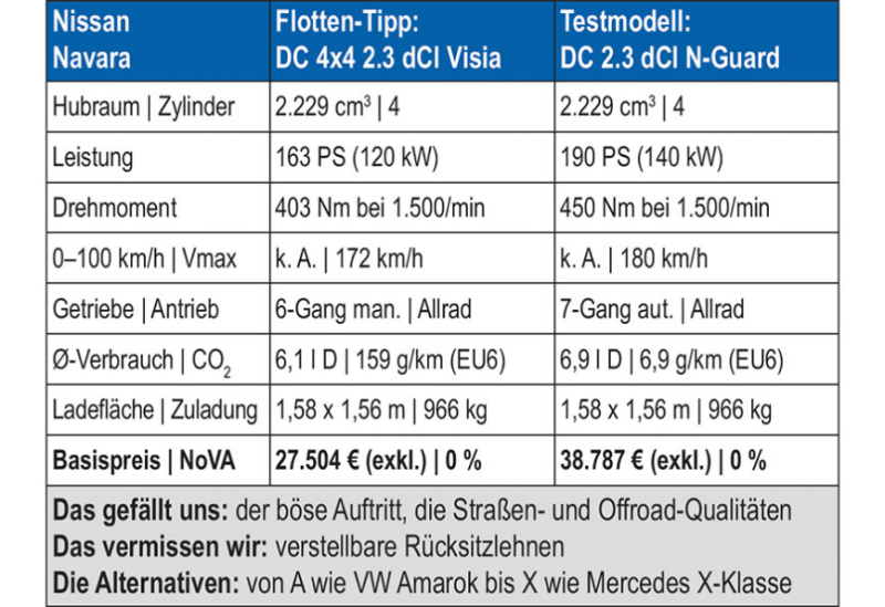Doch zurück zum eigentlichen Nissan, genauer gesagt, der „N-Guard“-Version, die Nissan seit dem vergangenen Jahr in Europa anbietet und das Nonplusultra der Baureihe darstellt. Lifestyle wird auf dem alten Kontinent in dem Fahrzeugsegment nämlich immer wichtiger, weshalb neben den klassischen Arbeiterqualitäten sowie einer robusten Bauweise und einer möglichst hohen Anhängelast beziehungsweise Zuladung auch Pkw-Features wie Teilledersitze, Navigationssystem oder Sitzheizung die Kaufentscheidung maßgeblich beeinflussen. All das hat der N-Guard serienmäßig mit an Bord. Einzige Einschränkung: Er wird hierzulande nur als „Double Cab“ mit zuschaltbarem Allradantrieb, 190-PS-Diesel, wahlweise mit 6-Gang-Schaltgetriebe (ab 37.370 Euro) oder 7-Gang-Automatik (ab 38.787 Euro) angeboten.