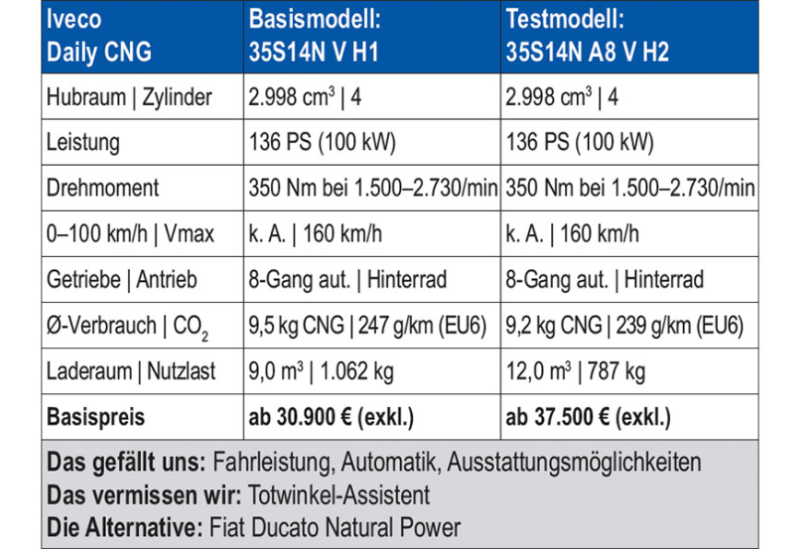 Das Netz an Erdgastankstellen ist mitüber 170 Standorten in Österreich sehr gut, bis auf wenige weiße Flecken stellt die Infrastruktur also kein Problem dar. Und wenn gerade keine Möglichkeit zum CNG-Zapfen besteht, hilft ein 14 Liter großer Benzin-Nottank zur Überbrückung weiter. Die Fahrleistungen können sich sehen lassen, der Dreiliter-Vierzylinder mit Turboaufladung bringt es auf 136 PS und ein Drehmoment von 350 Newtonmetern, damit geht dem Daily auch im beladenen Zustand (Nutzlast je nach Variante zwischen 787 und 1.062 Kilogramm) nicht so schnell die Puste aus. Ein Achtgang-Automatikgetriebe sorgt für besonders komfortables Fahren, die weichen und schnellen Gangwechsel stehen denen eines Pkw um nichts nach. Wir waren rund 700, vorwiegend auf der Autobahn gefahrene Kilometer unterwegs, der Durchschnittsverbrauch lag bei ziemlich genau zehn Kilogramm CNG auf 100 Kilometer. Die Preise pro Kilogramm liegen aktuell bei rund 1,10 Euro, jene von Diesel bei circa 1,20 Euro. Kosten- und verbrauchsseitig hält sich das also in etwa die Waage, dennoch kann Erdgas punkten: Die Emissionen sind deutlich geringer (wer Biogas tankt, fährt sogar CO2-neutral), zudem fallen Dinge wie verstopfte Dieselpartikelfilter beiüberwiegend niedrigen Geschwindigkeiten weg. Zudem ist das CNG-Fahrzeug im Vergleich zum Diesel um 4,5 dBA leiser.