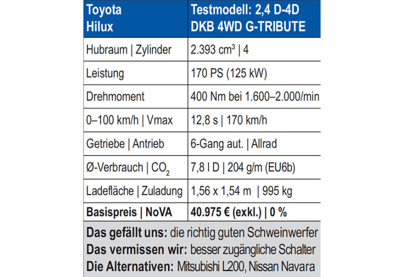 Standardmäßig wird der Allrad und Untersetzung mittels Drehschalter, die Differenzialsperre mittels Kippschalter aktiviert. Preislich bleibt der Toyota für das Gebotene im Rahmen: So ist der Hilux schon knapp ab 25.742 Euro zu haben, für 35.000 Euro (exkl.) gibt es die Top-Ausstattung mit Doppelkabine. Will man den G-Tribute. "G" steht übrigens für Gazoo-Racing, müssen nochmal 5.975 Euro (exkl.) draufgelegt werden. Dafür gibt es eine Leistungssteigerung von 20 PS gegenüber dem Standardmodell und schicke Dinge wie einen Überrollbügel, seitliche Einstiegsrohre, diverse Blenden, Front-und Unterfahrschutz. Auch beim Pick-up kauft das Auge eben mit.