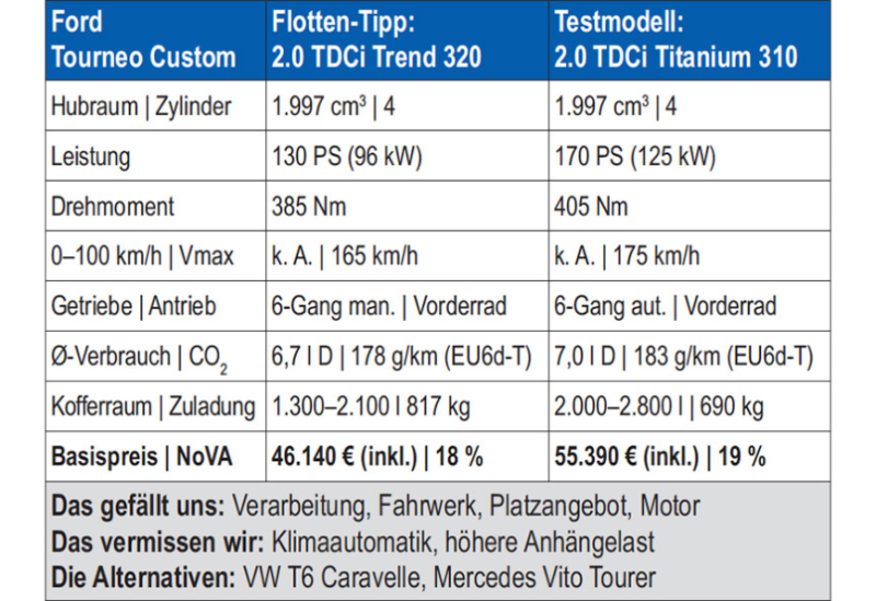 Zum Abschluss werfen wir noch einen Blick auf die Preisliste. Der Ford Tourneo Custom Bus mit kurzem Radstand mit 105 PS TDCi und Ambiente-Ausstattung startet bei vorsteuerabzugsfähigen 41.340 Euro, unser - am anderen Ende der Range angesiedeltes - Testauto ist ab 55.390 Euro zu haben. Die meisten Annehmlichkeiten sind da schon inklusive, empfehlenswert ist das Titanium-X-Paket (u. a. Xenon, Rückfahrkamera, Lederausstattung) für 3.264 Euro oder der Totwinkel-Warner für 612 Euro. Mit dem neuen Tourneo Custom Bus in Topausstattung hat Ford fast zu den Premiumanbietern aufgeschlossen. Wenn die Ausstattungspatzer nicht wären, könnte er sich bereits jetzt als Alternative etablieren.