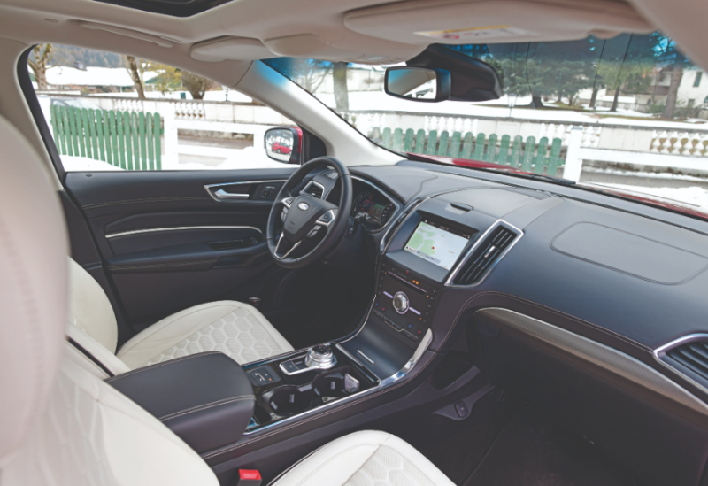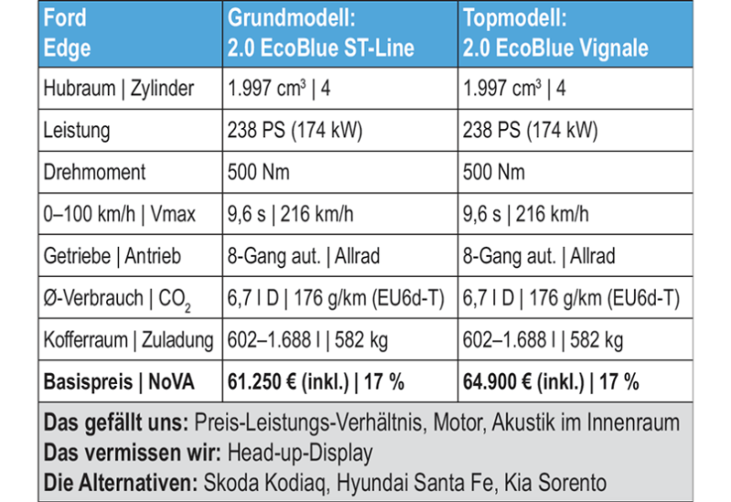 Und wie fährt sich der Edge? Der neue, 238 PS starke Turbodiesel ist wie geschaffen für das mit 2.133 Kilogramm nicht ganz leichte SUV, das bei Bedarf auch bis zu zwei Tonnen Anhängelast an den Haken nimmt. Die Achtgang-Automatik harmoniert perfekt mit dem Selbstzünder, wer den Sportmodus wählt, bekommt noch einmal spürbar mehr Punch, 9,6 Sekunden sind jedenfalls aller Ehren wert. Absolutes Oberklasse-Niveau erreicht die Geräuschdämmung, unglaublich, wie leise es im Innenraum zur Sache geht. Und für Freunde der digitalen Vernetzung hat Ford ebenfalls aufgerüstet, so gibt es eine eigene App, über die der Standort des Fahrzeuges oder der Tankstand abgefragt oder das Fahrzeug ver- beziehungsweise entriegelt werden kann.