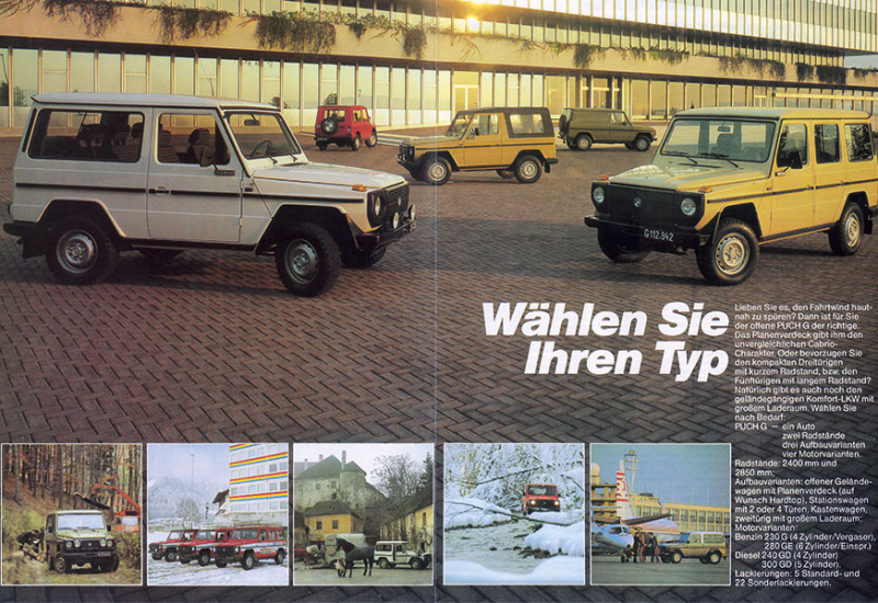 Vier Modelle standen ab Produktionsbeginn am 1. September 1979 zur Wahl: Die vollständig baugleichen Geländewagen wurden - sowohl bei Puch als auch bei Daimler-Benz - als 240 GD (72 PS), 300 GD (Fünfzylinder mit 80 PS), 230 G (90 oder 100 PS) und 280 GE (150 PS) bezeichnet und mit fünf unterschiedlichen Aufbauvarianten kombiniert. Als Puch wurde der G in den Vertriebsregionen von Steyr Puch - Österreich, Schweiz, Liechtenstein, das damalige Jugoslawien (bzw. die Nachfolgestaaten Serbien, Slowenien, Kroatien, Mazedonien und Bosnien-Herzegowina) sowie Großbritannien und Teilen Afrikas angeboten, in allen anderen Ländern als Mercedes. Wer seinen Mercedes-Benz G auch heute noch in einen Puch verwandeln lassen möchte, bekommt dies oder die Zutaten dafür quasi beim Hersteller (beim Puch-Kompetenzzentrum von Magna), dessen Servicegesellschaft auch die Restaurierung und Komponenten für gebrauchte Puch-Geländeautos anbietet. Während die rund 13.500 Peugeot P4 VLTT (mit 70-PS- Peugeot-Diesel) eine Lizenzproduktion waren, so wurden in Griechenland G-Modelle von Elbo aus Grazer CKD-Sätzen gefertigt.