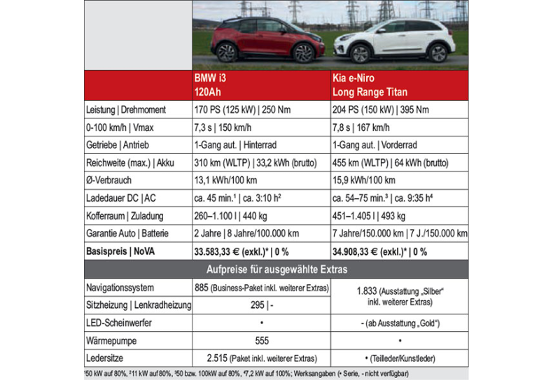 Man muss gar nicht allzu weit zurückblicken, die Reichweiten der E-Autos waren zum Start vielfach mau und damit nur einem sehr eingeschränkten Kreis an Usern zugänglich, vielfach als Firmenauto schlicht uninteressant. Mit einem Tesla konnte man freilich schon immer deutlich mehr Kilometer abspulen, die Preisklasse ist allerdings eher den Geschäftsführern und CEOs vorbehalten. Langsam, aber sicher stoßen auch die Fahrzeuge der kleineren Segmente bei der Reichweite in Regionen vor, die beginnen, interessant zu werden. Schließlich sind Sachbezugsbefreiung und Vorsteuerabzug sowohl für das Unternehmen als auch den Mitarbeiter starke Argumente. Grund genug, zwei Neuerscheinungen - den BMW i3 120Ah und den Kia e-Niro - näher auf die Räder oder vielmehr den Akku zu schauen.