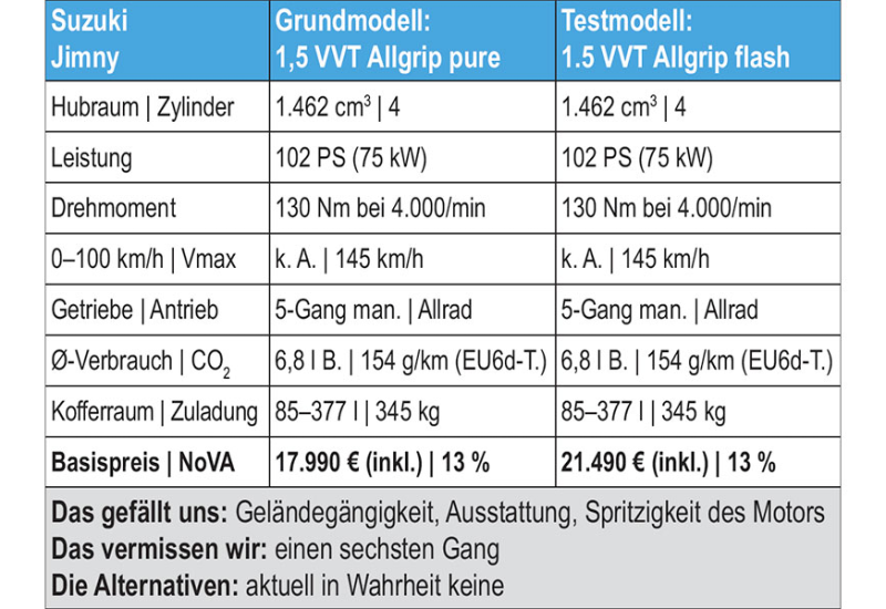 Dass es sich hier um ein Auto wie ein Schweizer Messer handelt, zeigt die umfangreiche Ausstattung, die auch Onroad zu gefallen weiß. Navi samt Smartphone-Anbindung mittels Apple CarPlay oder Android Auto, Tempomat und Klimaautomatik zeigen, dass das Auto wirklich up to date ist. Vier Personen finden gut Platz im Jimny, allerdings ist der Kofferraum dann so gut wie nicht mehr vorhanden. Klappt man die Rücksitzlehne um, ändert sich das aber. Der 1,5-Liter-Motor mit 102 PS ist spritziger als gedacht, auf eine Beschleunigungsangabe hat Suzuki aber trotzdem verzichtet. Das Getriebe ist exakt und knackig zu schalten, vor allem Überland würde man sich aber einen sechsten Gang wünschen, um Verbrauch und Geräuschkulisse zusenken. Aktuell - nach 6.260 gefahrenen Testkilometern - liegt der Schnittverbrauch bei 7,3 Litern und damit gar nicht weit entfernt von den werksseitig angegebenen 6,8 Litern. Das nächste Dauertest-Update folgt in der FLOTTE 07-08/2019.