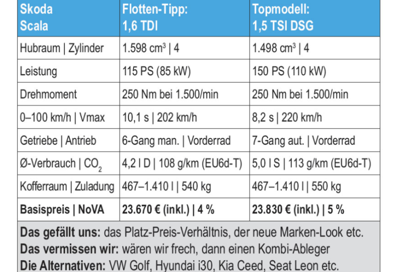 Sämtliche vom Start weg erhältliche Motoren bieten ausreichend Leistung, besonders souverän bewegt sich der Scala allerdings mit dem 1,6-Liter großen Selbstzünder und dem 150 PS starken Benziner. Was auf den ersten Testkilometern ebenfalls auffiel: Die Innenraumdämmung muss massiv ausgefallen sein, selbst bei Autobahntempo ist leises Unterhalten möglich. Ebenfalls top: Smartphone-Konnektivität, E-Sim-LTE-Karte und die digitalen Instrumente, die nun auch in einem Skoda erstmals die Navigationsinformationen hinterm Lenkrad darstellen können. Ebenfalls echt lässig: Der neue Scala kommt serienmäßig mit lichtstarken LED-Scheinwerfern, neun Airbags und zahlreichen Simply-Clever-Lösungen daher. Dank MQB-Basis gibt's als Extra außerdem neue Assistenzsysteme (unter anderem Spurhalte-und Seitenassistent).