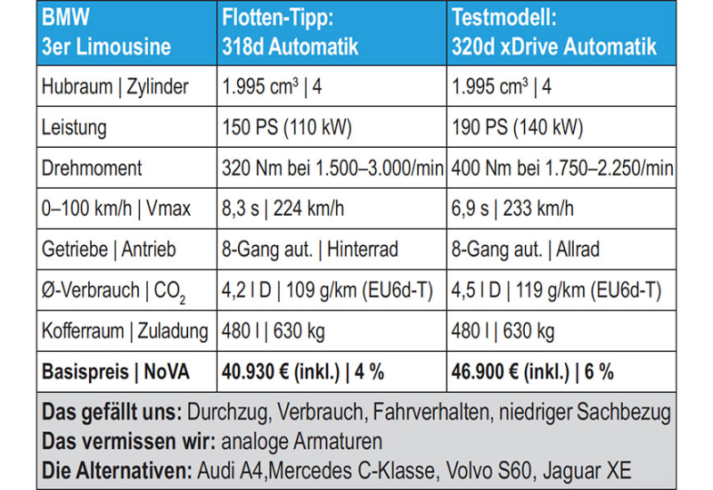 Kommen wir zur Paradediszplin des 3er BMW, der Freude am Fahren. Zunächst einmal eine kleine Warnung: Wer sich den Bayer im Sportoutfit samt zugehörigem Fahrwerk bestellt, darf sich nicht wundern, dass es auch beim Federungskomfort sportlich zur Sache geht. Was auf der kurvigen Bergstraße Spaß macht, ist auf langen Autobahnetappen dann mitunter kontraproduktiv. Daher unbedingt das adaptive M-Fahrwerk ordern, für rund 650 Euro extra. Die 190 PS sowie die 400 Newtonmeter Drehmoment des Vierzylinder-Turbodiesels reichen jedenfalls locker aus, um dem 3er mehr als ordentliche Fahrleistungen zu ermöglichen. In Kombination mit der formidablen Achtgang-Automatik zeigt der Tacho nach nur 6,9 Sekunden Tempo 100, mehr als respektabel. Selbiges - und das wird auch den Fuhrparkleiter freuen - gilt auch für den Verbrauch. Um die fünf Liter Diesel reichen für 100 Kilometer, sparsame Naturen zaubern sogar eine vier vor das Komma.