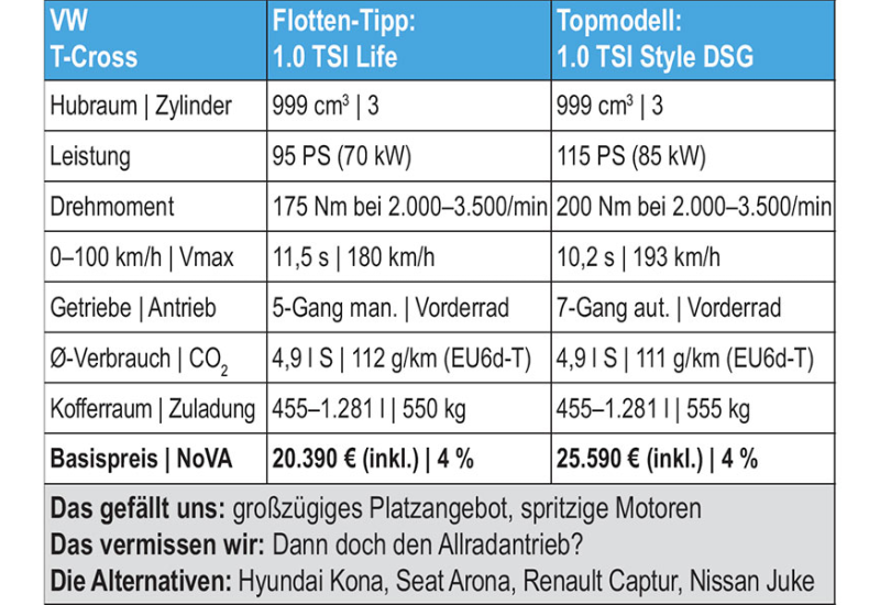 Motorisch reicht aber der 95-PS-T-Cross locker aus, das kleine Dreizylinder-Triebwerk gefällt mit erfrischendem Durchzug und guten Punch bei niedrigen Drehzahlen, DSG gibt's allerdings nur für die stärkere Variante. Auch das Fahrverhalten ist durchaus knackig, dank kompakter Abmessungen - die Länge beträgt lediglich 4,10 Meter - fühlt sich der jüngste VW-Spross vor allem, aber nicht nur in der Stadt pudelwohl. Wie nahe man dem werksseitig angegebenen Verbrauch von 4,9 Litern in der Praxis kommt, wird ein intensiverer Test in der kommenden Ausgabe der FLOTTE zeigen, mit Werten um die 111 Gramm CO2 pro Kilometer fällt man jedenfalls locker in die Klasse mit 1,5-prozentigem Sachbezug.