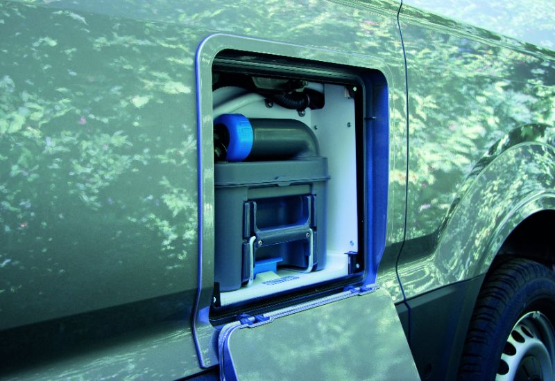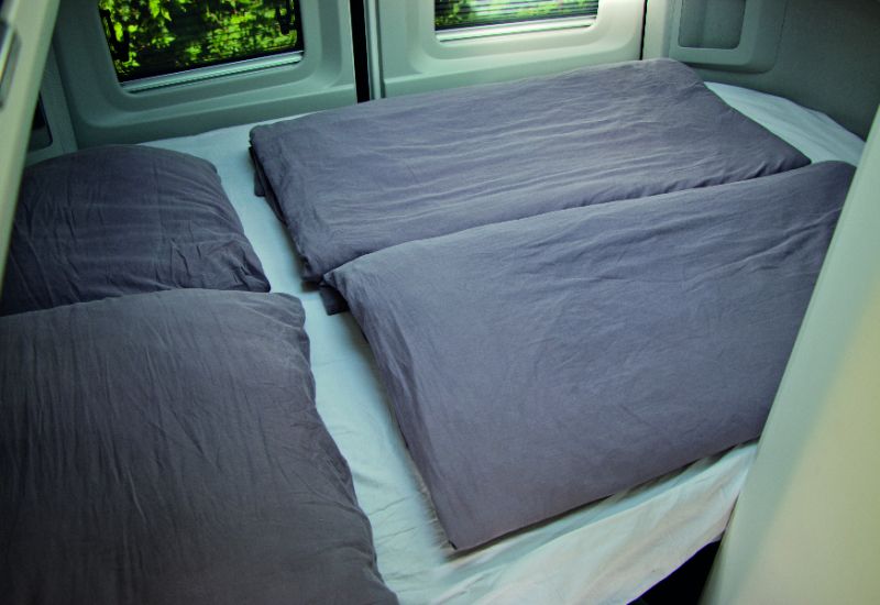Wie sehr man sich wohlfühlt, sobald die Schlafenszeit anbricht, hängt von zwei Faktoren ab. Zum einen von der Körpergröße der Mitreisenden, zum anderen von deren Anzahl. Theoretisch haben bis zu vier Personen Platz, zusätzlich zum Heckbett lässt sich optional ein Hochbett ordern, das vor Gebrauch über der Sitzgruppe ausgezogen wird. Das ist allerdings auf der einen Seite 190 (allerdings mit Schräge auf der Vorderseite), auf der anderen gar nur 160 Zentimeter lang und somit für nur einen Erwachsenen oder zwei (noch nicht allzu große) Kinder geeignet.