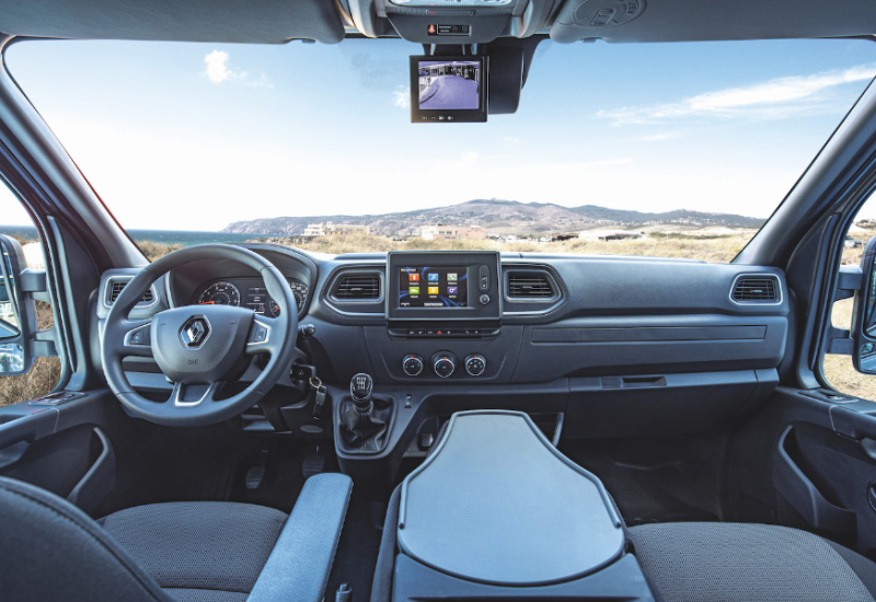 Optisch fällt zunächst das neue Lenkrad auf, schade, dass man das nicht zumindest wie bei vielen anderen Herstellern gegen Aufpreis in Leder bekommt. Zwischen den beiden Lüftungsdüsen thront das neue Navigationssystem, das in der teureren Version zwar mit Android Auto, nicht aber mit Apple CarPlay kompatibel ist und 1.050 Euro (alle Preise netto) kostet. Die Möglichkeit, das Smartphone induktiv zu laden, kostet 150 Euro extra. Generell ist die Liste der möglichen Extras deutlich länger geworden, nun sind auch sicherheitsrelevante Features wie ein Totwinkel-Warner (für 150 Euro ein absolutes Muss!) oder ein Spurhaltewarner zu haben. Das Rücksicht-Assistenzsystem für 800 Euro besteht aus einer rückwärtigen Kamera und einem statt des Innenspiegels angebrachten Display. Eine gute Idee, die technisch leider mangelhaft umgesetzt wurde: Die zu geringe Auflösung und Bildwiederholfrequenz verursacht ein unangenehmes Flimmern, ganz schlimm ist das bei Nachtfahrten. Punkten kann der Renault Master weiter mit seiner Vielfalt, über 200 Varianten sind ab Werk verfügbar.