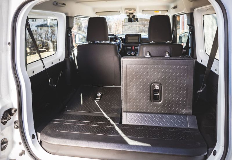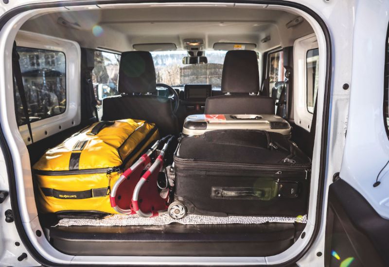 Nennenswerten Laderaum - 377 Liter - realisiert man im "Suzi-Jeep" durch Umlegen der beiden Rücksitze (50:50 umklappbar). Je nach Ausstattung ist eine Laderaumbox verfügbar, durch welche der Boden des Kofferraums komplett flach wird. Die Kunststoffverkleidung dieses Laderaums lässt sich vermutlich gut sauber kärchern, sollte der Schweiß der Jagdbeute frühzeitig Krusten gebildet haben, stellt aber andererseits auch einen äußerst rutschigen Unterboden für den Wocheneinkauf dar. Um tief fliegende Mineralwasserkisten hintanzuhalten, verweist Suzuki auf serienmäßige Vorrichtungen für Gepäckhaken und andere Befestigungen, welche im Zubehörprogramm erhältlich sind.