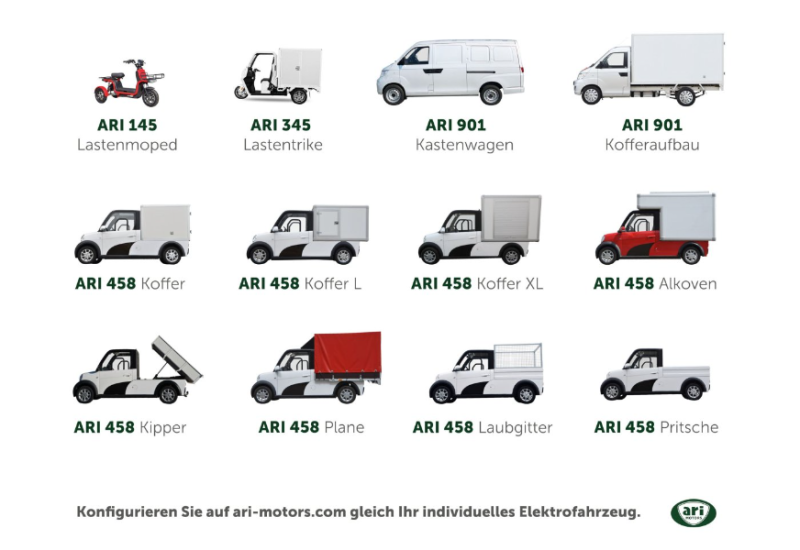 Die Fahrzeuge sind für den Einsatz auf der letzten Meile zugeschnitten. Das Portfolio umfasst ein Lastenmoped und ein Lastentrike mit mehr als 300 Kilogramm Zuladung ebenso, wie den ARI 458: Ein vielseitiger E-Leichttransporter, der als Pritsche, Kipper, mit Aufbau oder als Spezialanfertigung etwa als Foodtruck verfügbar ist. Preislich startet der ARI 458 ohne Förderung bei 11.700 Euro netto inklusive Akku: „Damit sind wir deutlich günstiger als viele Mitbewerber am Markt”, sagt Thomas Kuwatsch, einer der Gründer und Finanzchef der ARI Motors GmbH aus Leipzig.