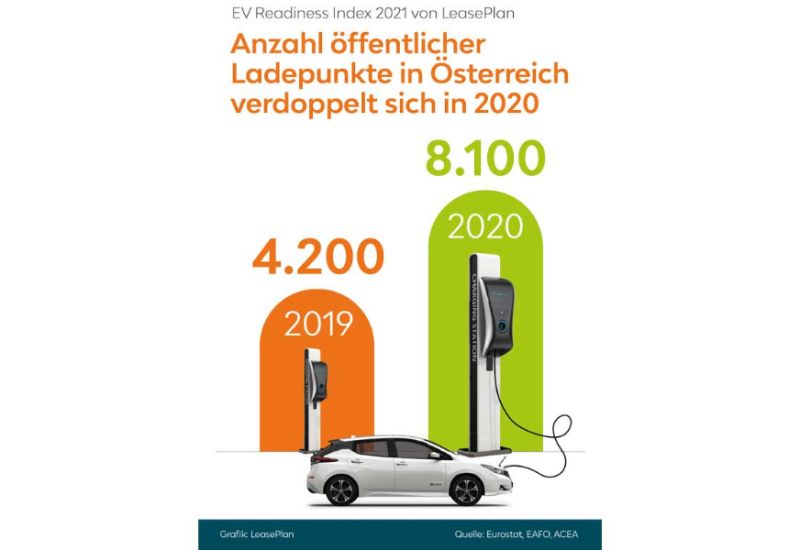 Der Marktanteil von E-Fahrzeugen auf Österreichs Straßen hat sich im Jahr 2020 mehr als verdoppelt und liegt bei 8,2 % (2019: 3,4 % Marktanteil). Die gleiche Entwicklung zeigt die Anzahl der öffentlichen Ladepunkte, die von 4.200 im Jahr 2019 auf 8.100 in 2020 hochgeschnellt ist. Für diesen Boost haben staatliche Anreize eine entscheidende Rolle gespielt: Österreich ist führend bei Förderungen und Steuervorteilen. Das zeigt die neue Ausgabe der jährlichen LeasePlan-Studie „EV Readiness Index 2021“, die 22 europäische Länder auf die Bereitschaft für E-Mobilität untersucht.