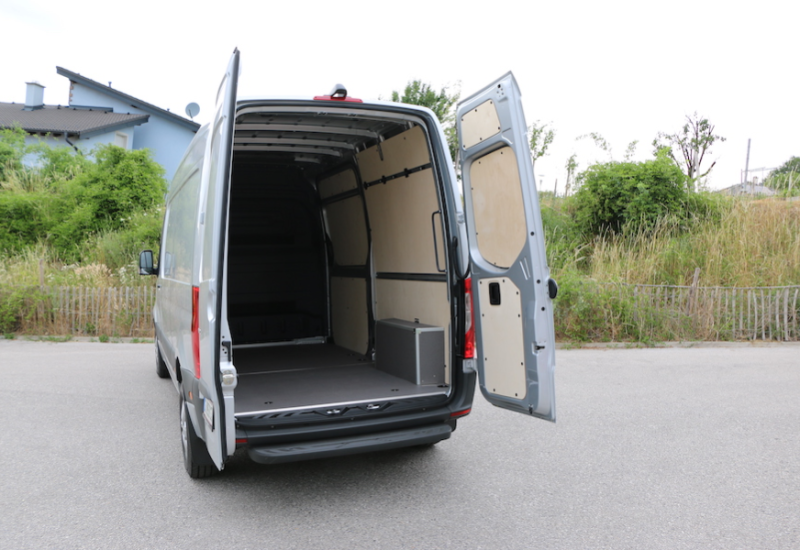 Von außen sieht man dem eSprinter den Elektroantrieb abgesehen von der Typbezeichnung am Heck gar nicht an. Dabei muss sich der elektrische Sprinter nicht für seinen Antrieb schämen. Der ist spritzig und passt wunderbar zum großen Mercedes, da das Drehmoment vom Stand weg voll zur Verfügung steht, ist der Antritt auch beladen sehr gut. Bis zu 120 km/h ist der eSprinter schnell, das genügt, um auch auf der Autobahn kein Verkehrshindernis zu sein. Wenngleich die Autobahn freilich nicht das Stammrevier des E-Transporters sein sollte, schließlich steigt der Stromverbrauch dann doch deutlich an und die Reichweite sinkt entsprechend.