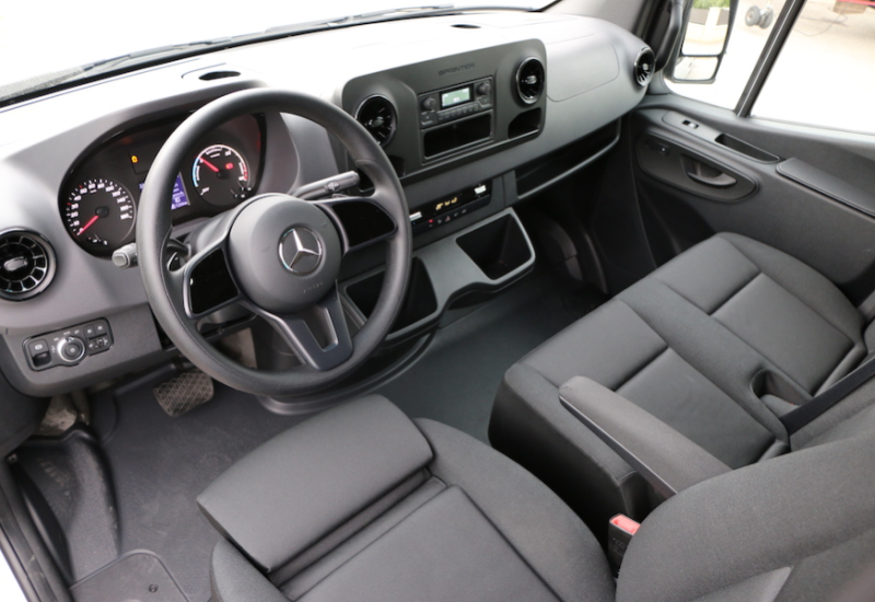Und die ist schon von Haus aus nicht allzu üppig bemessen, schließlich schafft man mit dem Standardakku, der es auf 35 nutzbare kWh bringt, gerade einmal 119 Kilometer nach WLTP. Unser Testauto war optional mit der 47 kWh großen Batterie – Aufpreis 7.500 Euro netto – ausgestattet, dann steigt die Reichweite auf 157 Kilometer. In der Praxis hängt viel von der Beladung, der Witterung und der Schwere des Gasfußes ab. Innerstädtisch können diese Werte also durchaus überboten werden, im Winter auf der Autobahn könnten die Kilometer aber rapide purzeln. Top ist indes die Ladeleistung, zweiphasig mit Wechselstrom bei 7,4 kW dauert der Vorgang sechs – bei der kleineren Batterie –beziehungsweise acht Stunden oder mit Gleichstrom und 20 kW dauert es 70 beziehungsweise 90 Minuten auf 80 Prozent. Optional bekommt man für 485 Euro DC-Laden mit 80 kW, dann hängt der eSprinter nur noch 20 beziehungsweise 25 Minuten am Stecker. Beeindruckend: Bei unserer Testladung fiel diese Leistung auch über 80 Prozent Ladezustand kaum ab.