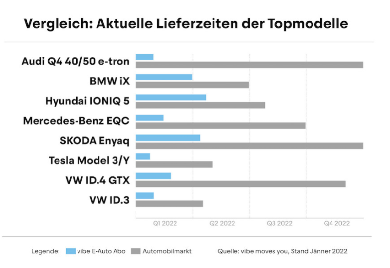 Während Käufer im Handel aktuell bis zu 12 Monate oder länger auf Modelle wie bspw. den Audi Q4 e-tron, Skoda Enyaq oder Hyundai Ioniq 5 warten müssen, kann vibe moves you, der erste markenübergreifende E-Auto-Abo-Anbieter in Österreich, auch die beliebtesten Modelle deutlich schneller zur Verfügung stellen.