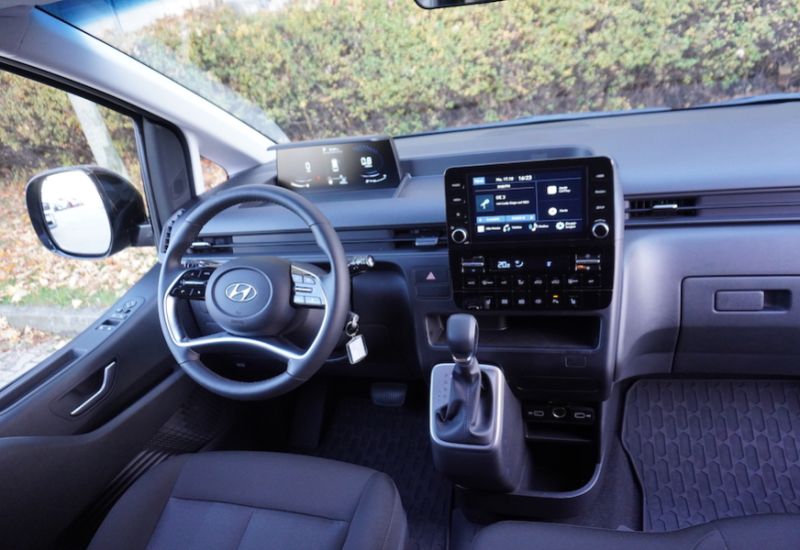 Und doch ist es just die Ausstattung, die den Staria nebst der Optik glänzen lässt. Zu einem sehr niedrigen Startpreis von 25.960 Euro (das ist, der Vollständigkeit halber, deutlich günstiger als bei Ford und Renault) bekommt man hier bereits zwei Schiebetüren, Parksensoren rundum samt Rückfahrkamera, Klima, Bluetooth, Android Auto und Apple Carplay im 8-Zoll-Infotainment-System, diverse Helferlein wie einen Seitenwindassistenten, Tempomat oder aktive Spurfolge und vieles mehr. Für 2.000 Euro mehr gibt's sodann den "Business Van", also unseren Testwagen, der nebst LED-Leuchten noch eine Heckklappe statt Doppeltüren und so manch Annehmlichkeit wie Sitz- und Lenkradheizung dem Mix hinzufügt beziehungsweise den regulären gegen einen adaptiven Tempomaten tauscht, sofern man sich für die Automatik entschieden hat.
