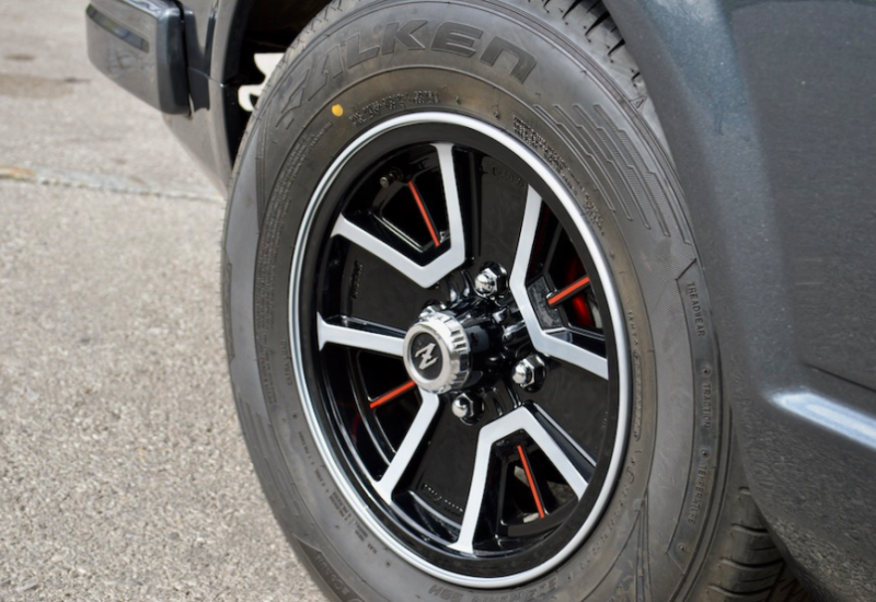 Bis die Scheinwerfer verlässlich strahlten und die Sitze exakt passten – die Bodenplatte wurde tiefergesetzt, Kaltenbrunner will schließlich aufrecht und bequem sitzen können – sammelte sich frisches Know-how an. Überrascht wurde er von der guten Teileversorgung aus den USA. Die Lieferungen, etwa 15-mal wurde bestellt, kamen meist in fünf Tagen über den großen Teich. Die roten Linien an den Felgen wurden per Hand mit dem Pinstriper aufgetragen. Der rote Faden zieht sich seitlich über einen Großteil des Autos und setzt sich innen fort. Nähte am Lenkrad, Schaltstock, Handbremshebel und schließlich die Halteschnüre der Hutablage sowie die Zurrgurte für das Gepäck, nicht zu vergessen der Motorblock, heben sich vom mittelgraudunkelgrau-schwarzen Rest ab.